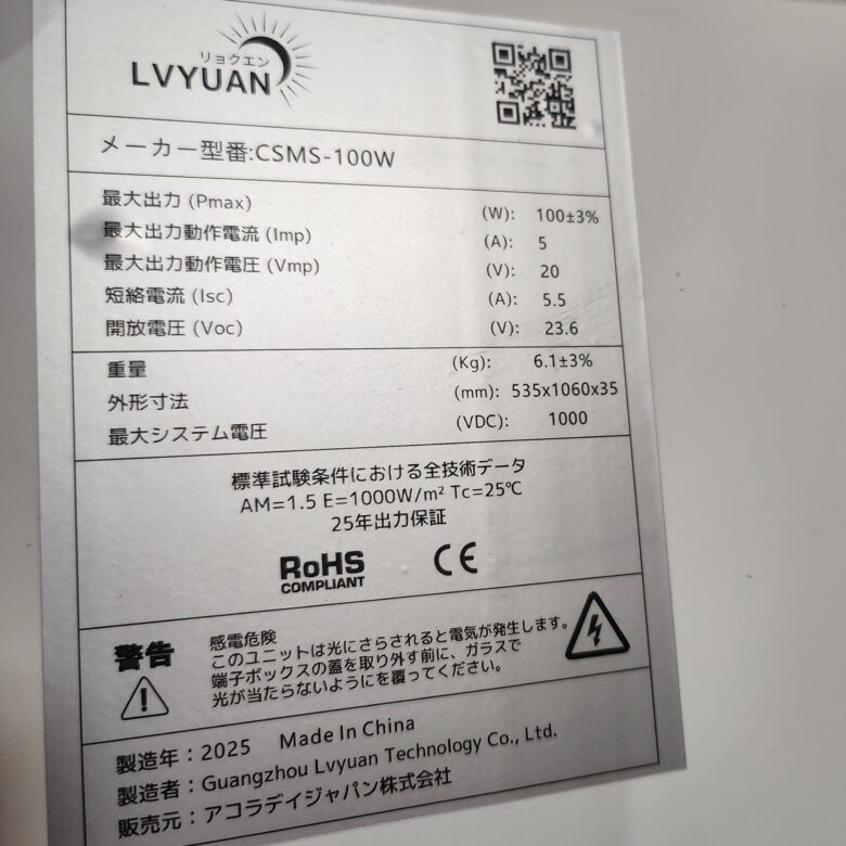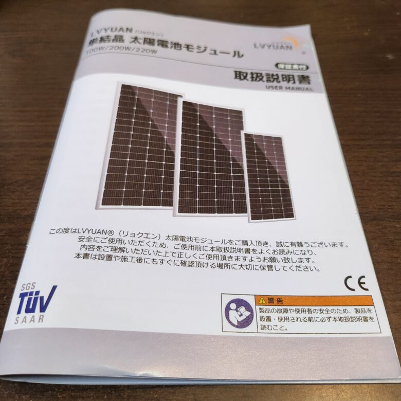 以前購入した100Wの【LVYUAN100Wシルバーパネル】【LVYUAN100Wブラックパネル】のいずれにも無かったシールが貼られ、説明書も冊子の物になっていました!