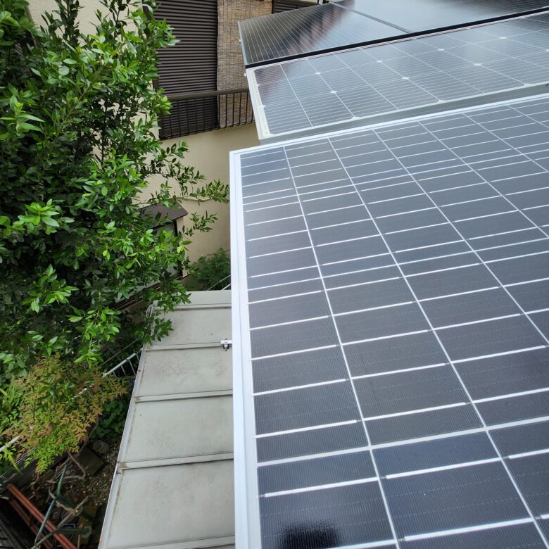パネル間約8㎝位の間隔が有り、雨が降ると架台からも1階屋根に滴るので修正しました!