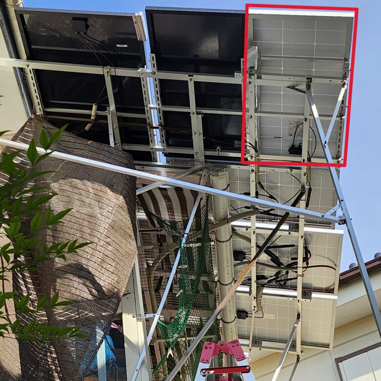 故障したパネルに付いているリョクエン ソーラーパネル架台は再利用するので取り外してから新しいパネルに再取付する段取りです。