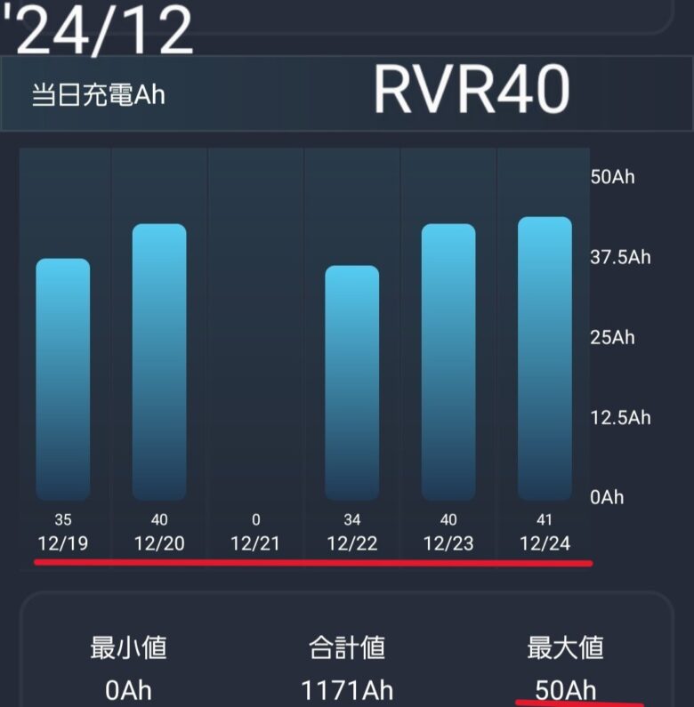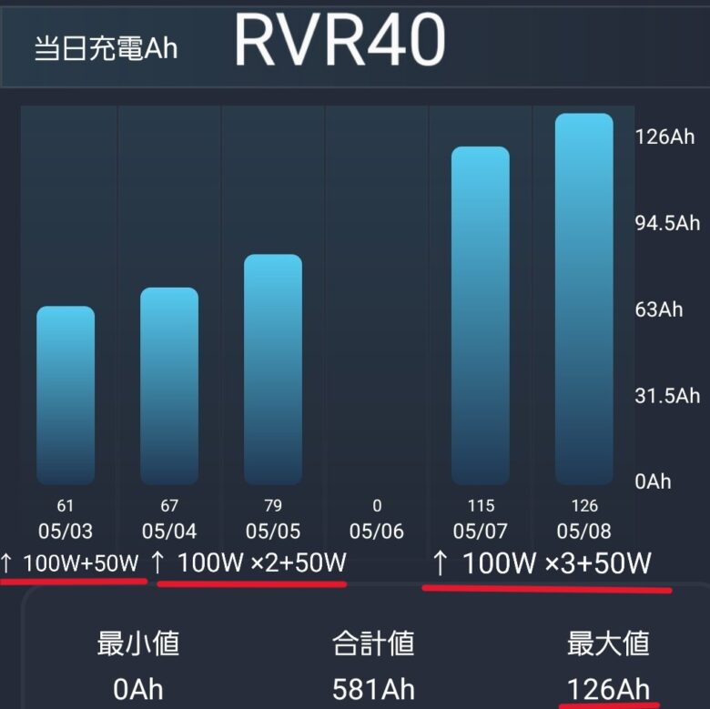パネル増設後には蓄電が100A以上を記録!春から秋にかけては問題なさそうで、大成功です!