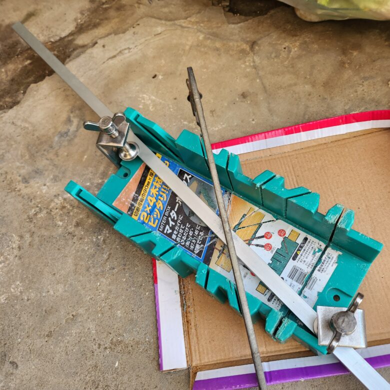 金切鋸を使って余っていた15mm角パイプをカットして「屋根裏換気用・軒下換気扇」用100Wパネルの架台に接続して取り付けました!