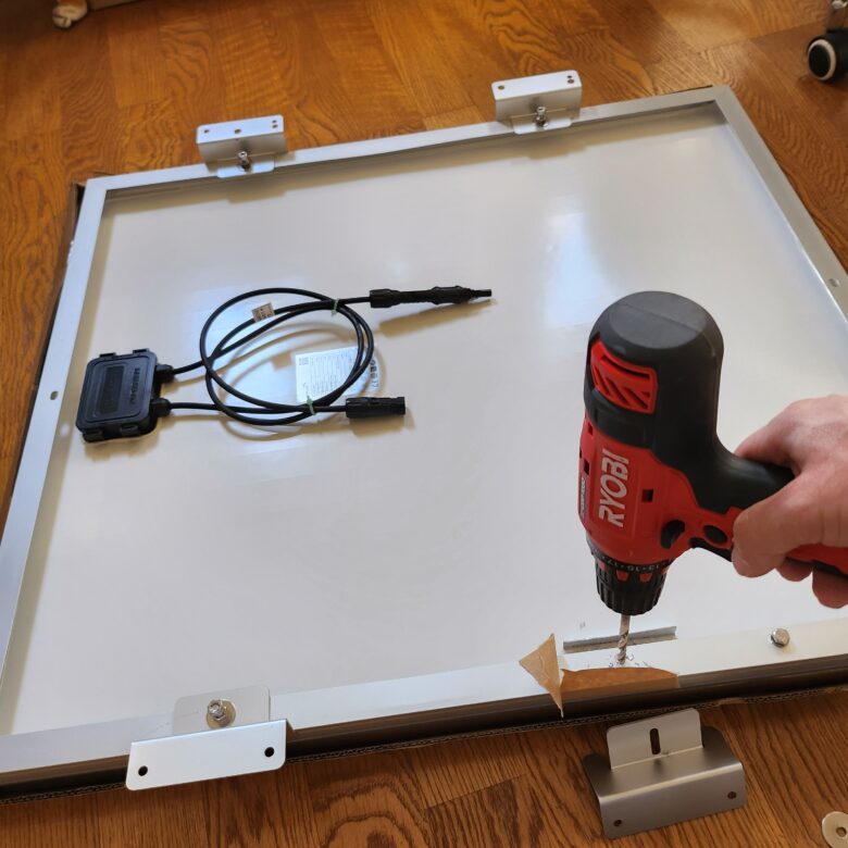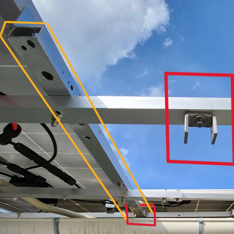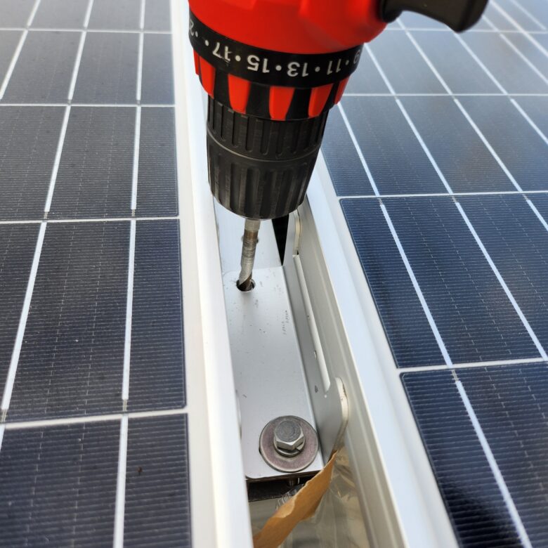 架台奥側の15mm角パイプは斜めって取り付けたので、、パネルに取付けたZブラケットの穴位置を修正しないといけなくなりました…