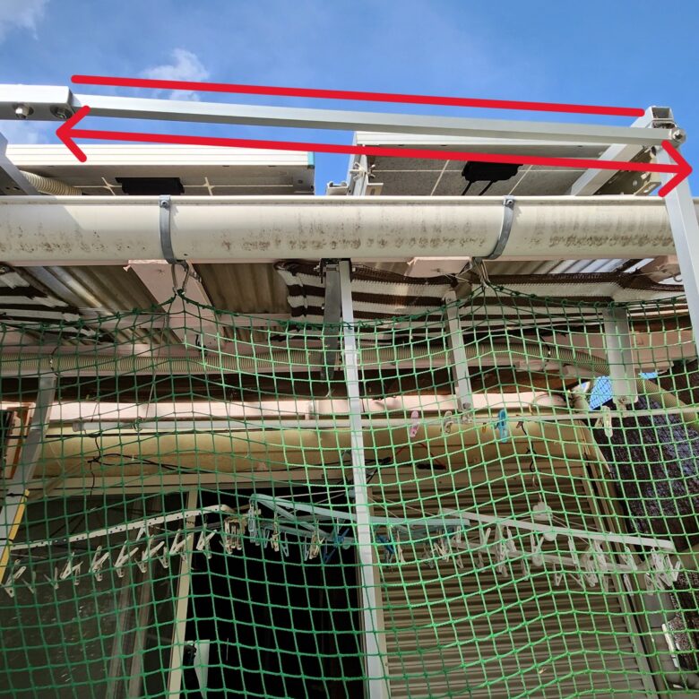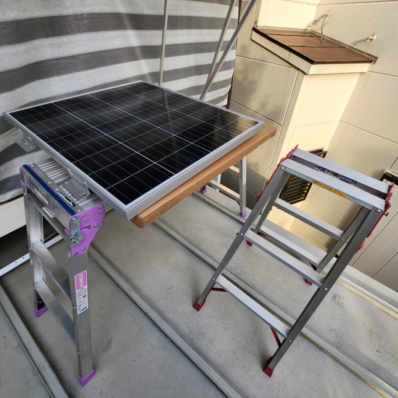 アルインコの脚立にパネルを乗せて、ベランダ屋根上の架台にパネルを乗せます!