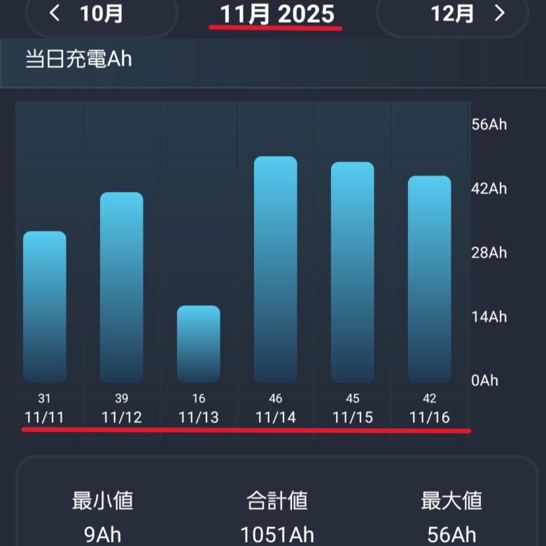 パネル増設後には蓄電が100A以上を記録!春から秋にかけては問題なさそうで、大成功です!